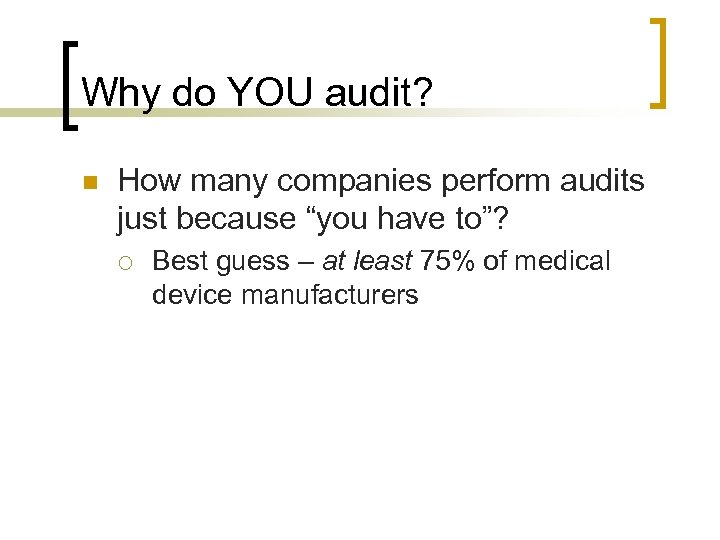 Why do YOU audit? n How many companies perform audits just because “you have to”? ¡ Best guess – at least 75% of medical device manufacturers