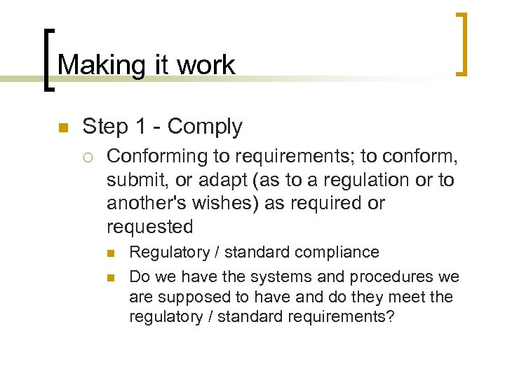 Making it work n Step 1 - Comply ¡ Conforming to requirements; to conform, submit, or adapt (as to a regulation or to another's wishes) as required or requested n n Regulatory / standard compliance Do we have the systems and procedures we are supposed to have and do they meet the regulatory / standard requirements?