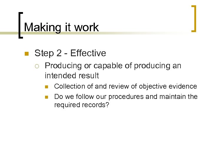 Making it work n Step 2 - Effective ¡ Producing or capable of producing an intended result n n Collection of and review of objective evidence Do we follow our procedures and maintain the required records?