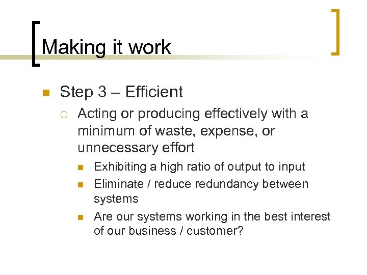 Making it work n Step 3 – Efficient ¡ Acting or producing effectively with a minimum of waste, expense, or unnecessary effort n n n Exhibiting a high ratio of output to input Eliminate / reduce redundancy between systems Are our systems working in the best interest of our business / customer?