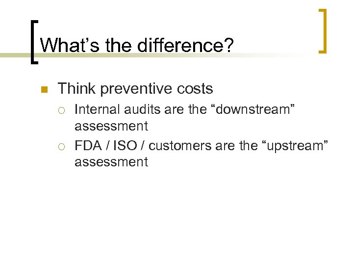 What’s the difference? n Think preventive costs ¡ ¡ Internal audits are the “downstream” assessment FDA / ISO / customers are the “upstream” assessment