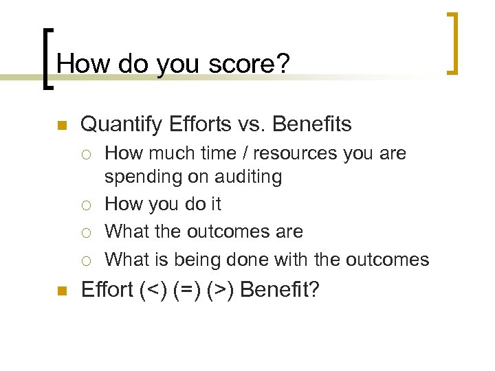 How do you score? n Quantify Efforts vs. Benefits ¡ ¡ n How much time / resources you are spending on auditing How you do it What the outcomes are What is being done with the outcomes Effort (<) (=) (>) Benefit?