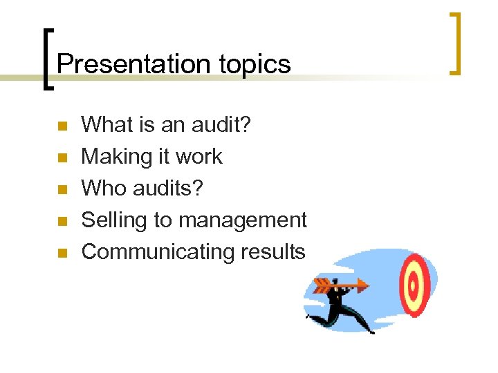 Presentation topics n n n What is an audit? Making it work Who audits? Selling to management Communicating results
