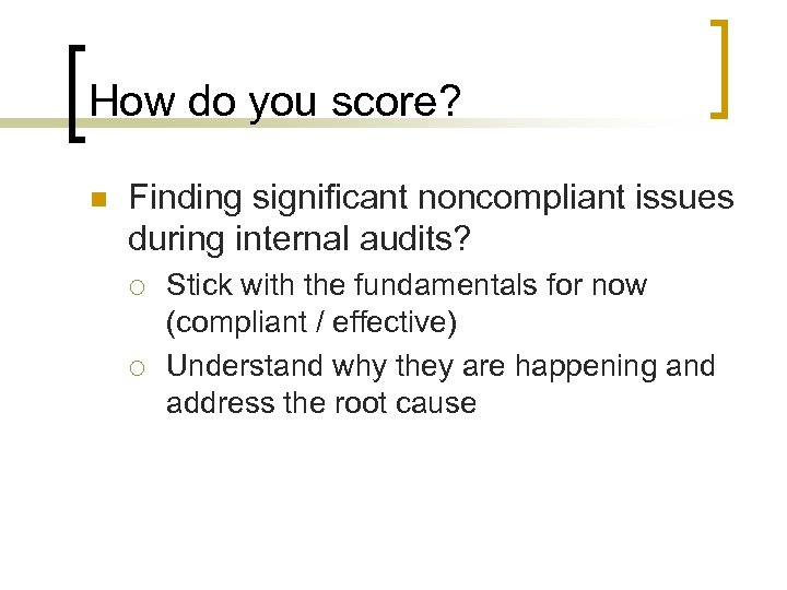 How do you score? n Finding significant noncompliant issues during internal audits? ¡ ¡ Stick with the fundamentals for now (compliant / effective) Understand why they are happening and address the root cause