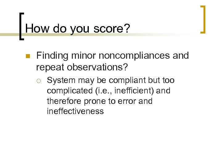 How do you score? n Finding minor noncompliances and repeat observations? ¡ System may be compliant but too complicated (i. e. , inefficient) and therefore prone to error and ineffectiveness