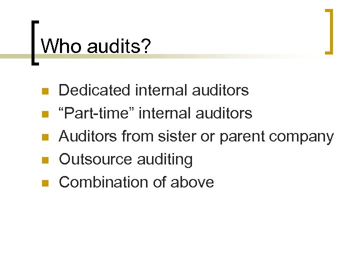 Who audits? n n n Dedicated internal auditors “Part-time” internal auditors Auditors from sister or parent company Outsource auditing Combination of above