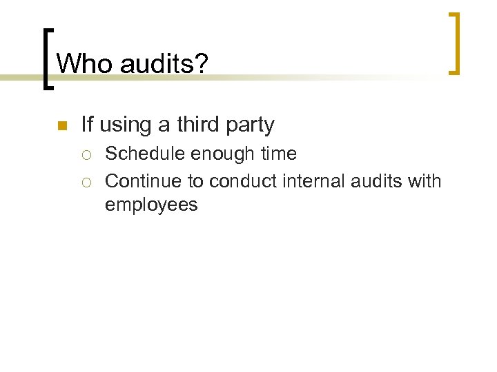 Who audits? n If using a third party ¡ ¡ Schedule enough time Continue to conduct internal audits with employees