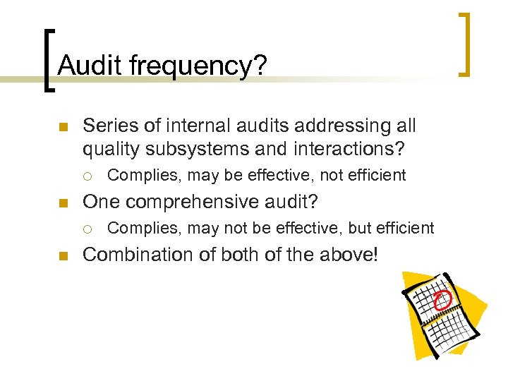 Audit frequency? n Series of internal audits addressing all quality subsystems and interactions? ¡ n One comprehensive audit? ¡ n Complies, may be effective, not efficient Complies, may not be effective, but efficient Combination of both of the above!