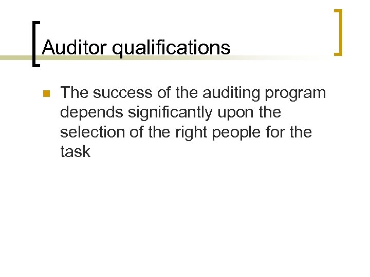 Auditor qualifications n The success of the auditing program depends significantly upon the selection of the right people for the task