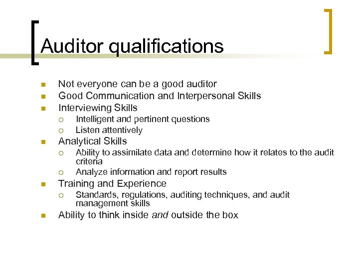 Auditor qualifications n n n Not everyone can be a good auditor Good Communication and Interpersonal Skills Interviewing Skills ¡ ¡ n Analytical Skills ¡ ¡ n Ability to assimilate data and determine how it relates to the audit criteria Analyze information and report results Training and Experience ¡ n Intelligent and pertinent questions Listen attentively Standards, regulations, auditing techniques, and audit management skills Ability to think inside and outside the box