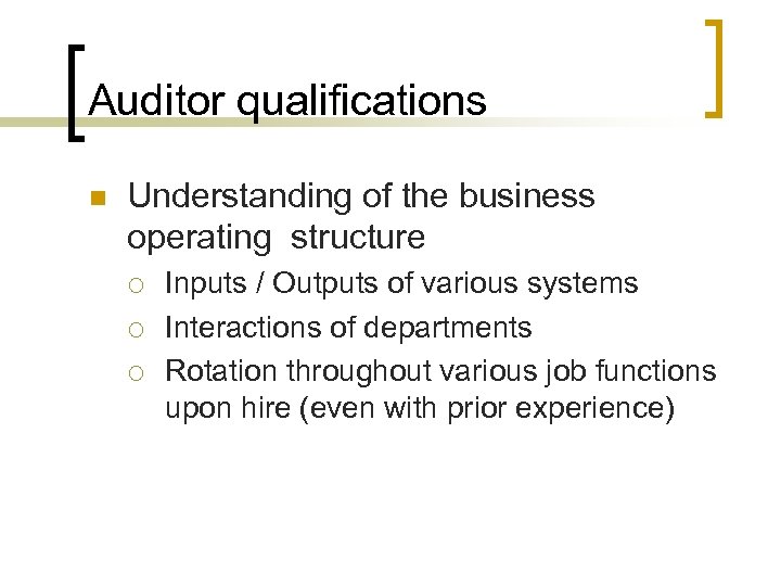 Auditor qualifications n Understanding of the business operating structure ¡ ¡ ¡ Inputs / Outputs of various systems Interactions of departments Rotation throughout various job functions upon hire (even with prior experience)