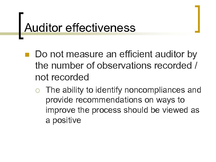 Auditor effectiveness n Do not measure an efficient auditor by the number of observations recorded / not recorded ¡ The ability to identify noncompliances and provide recommendations on ways to improve the process should be viewed as a positive