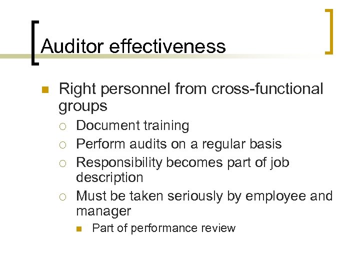 Auditor effectiveness n Right personnel from cross-functional groups ¡ ¡ Document training Perform audits on a regular basis Responsibility becomes part of job description Must be taken seriously by employee and manager n Part of performance review