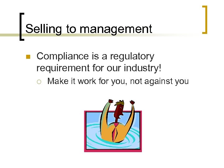 Selling to management n Compliance is a regulatory requirement for our industry! ¡ Make it work for you, not against you