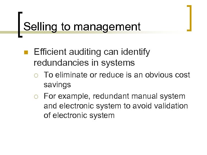 Selling to management n Efficient auditing can identify redundancies in systems ¡ ¡ To eliminate or reduce is an obvious cost savings For example, redundant manual system and electronic system to avoid validation of electronic system