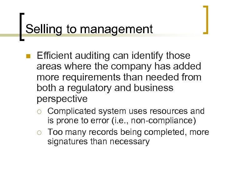 Selling to management n Efficient auditing can identify those areas where the company has added more requirements than needed from both a regulatory and business perspective ¡ ¡ Complicated system uses resources and is prone to error (i. e. , non-compliance) Too many records being completed, more signatures than necessary