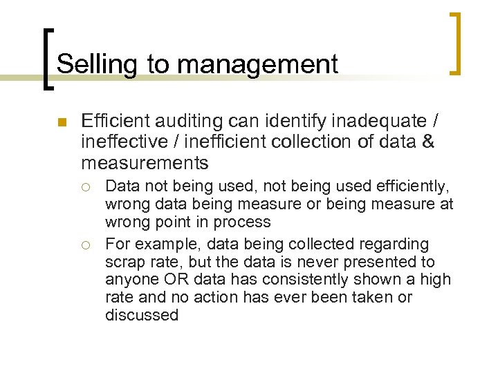Selling to management n Efficient auditing can identify inadequate / ineffective / inefficient collection of data & measurements ¡ ¡ Data not being used, not being used efficiently, wrong data being measure or being measure at wrong point in process For example, data being collected regarding scrap rate, but the data is never presented to anyone OR data has consistently shown a high rate and no action has ever been taken or discussed