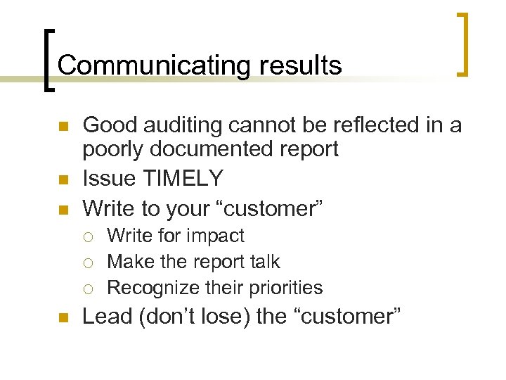 Communicating results n n n Good auditing cannot be reflected in a poorly documented report Issue TIMELY Write to your “customer” ¡ ¡ ¡ n Write for impact Make the report talk Recognize their priorities Lead (don’t lose) the “customer”