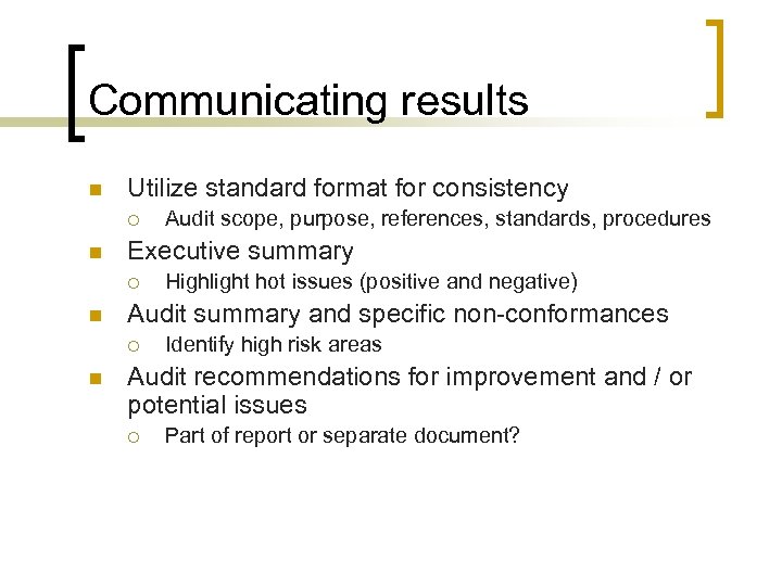 Communicating results n Utilize standard format for consistency ¡ n Executive summary ¡ n Highlight hot issues (positive and negative) Audit summary and specific non-conformances ¡ n Audit scope, purpose, references, standards, procedures Identify high risk areas Audit recommendations for improvement and / or potential issues ¡ Part of report or separate document?