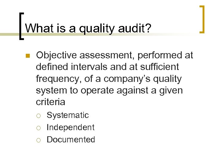 What is a quality audit? n Objective assessment, performed at defined intervals and at sufficient frequency, of a company’s quality system to operate against a given criteria ¡ ¡ ¡ Systematic Independent Documented