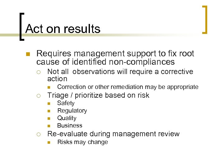 Act on results n Requires management support to fix root cause of identified non-compliances ¡ Not all observations will require a corrective action n ¡ Triage / prioritize based on risk n n ¡ Correction or other remediation may be appropriate Safety Regulatory Quality Business Re-evaluate during management review n Risks may change