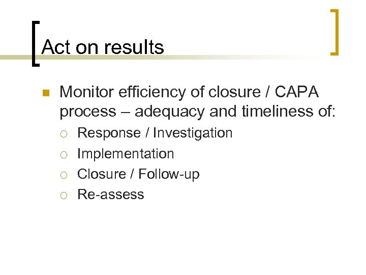 Act on results n Monitor efficiency of closure / CAPA process – adequacy and timeliness of: ¡ ¡ Response / Investigation Implementation Closure / Follow-up Re-assess