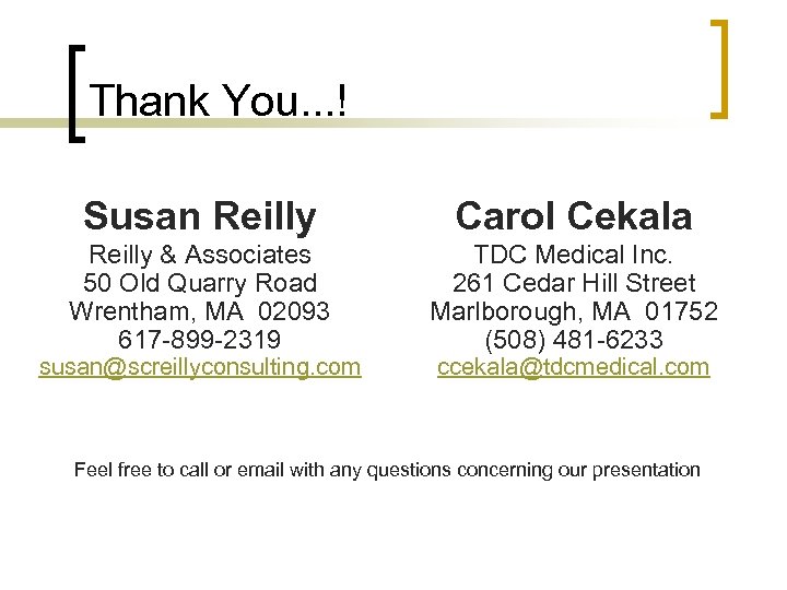 Thank You. . . ! Susan Reilly Carol Cekala Reilly & Associates 50 Old Quarry Road Wrentham, MA 02093 617 -899 -2319 TDC Medical Inc. 261 Cedar Hill Street Marlborough, MA 01752 (508) 481 -6233 susan@screillyconsulting. com ccekala@tdcmedical. com Feel free to call or email with any questions concerning our presentation