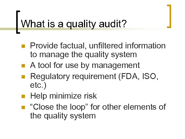 What is a quality audit? n n n Provide factual, unfiltered information to manage the quality system A tool for use by management Regulatory requirement (FDA, ISO, etc. ) Help minimize risk “Close the loop” for other elements of the quality system