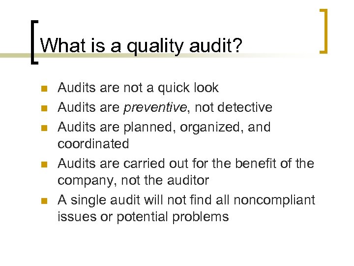 What is a quality audit? n n n Audits are not a quick look Audits are preventive, not detective Audits are planned, organized, and coordinated Audits are carried out for the benefit of the company, not the auditor A single audit will not find all noncompliant issues or potential problems