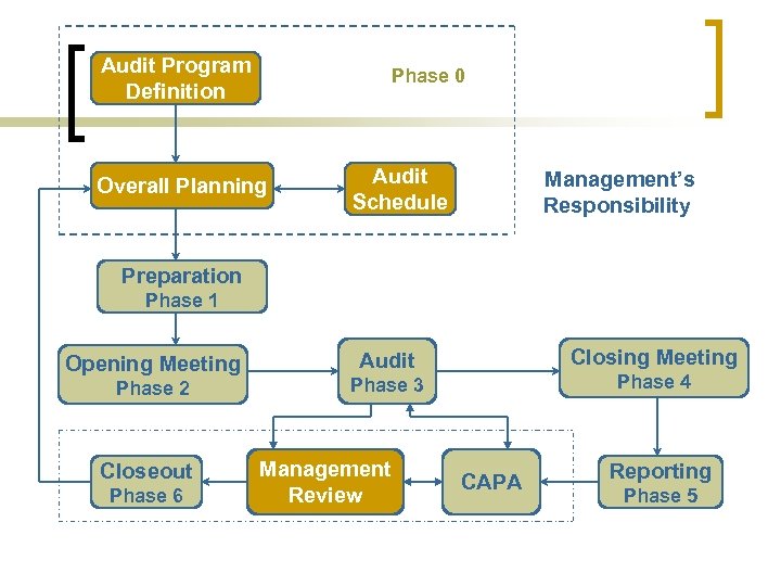 Audit Program Definition Phase 0 Overall Planning Audit Schedule Management’s Responsibility Preparation Phase 1 Opening Meeting Phase 2 Closeout Phase 6 Closing Meeting Audit Phase 4 Phase 3 Management Review CAPA Reporting Phase 5