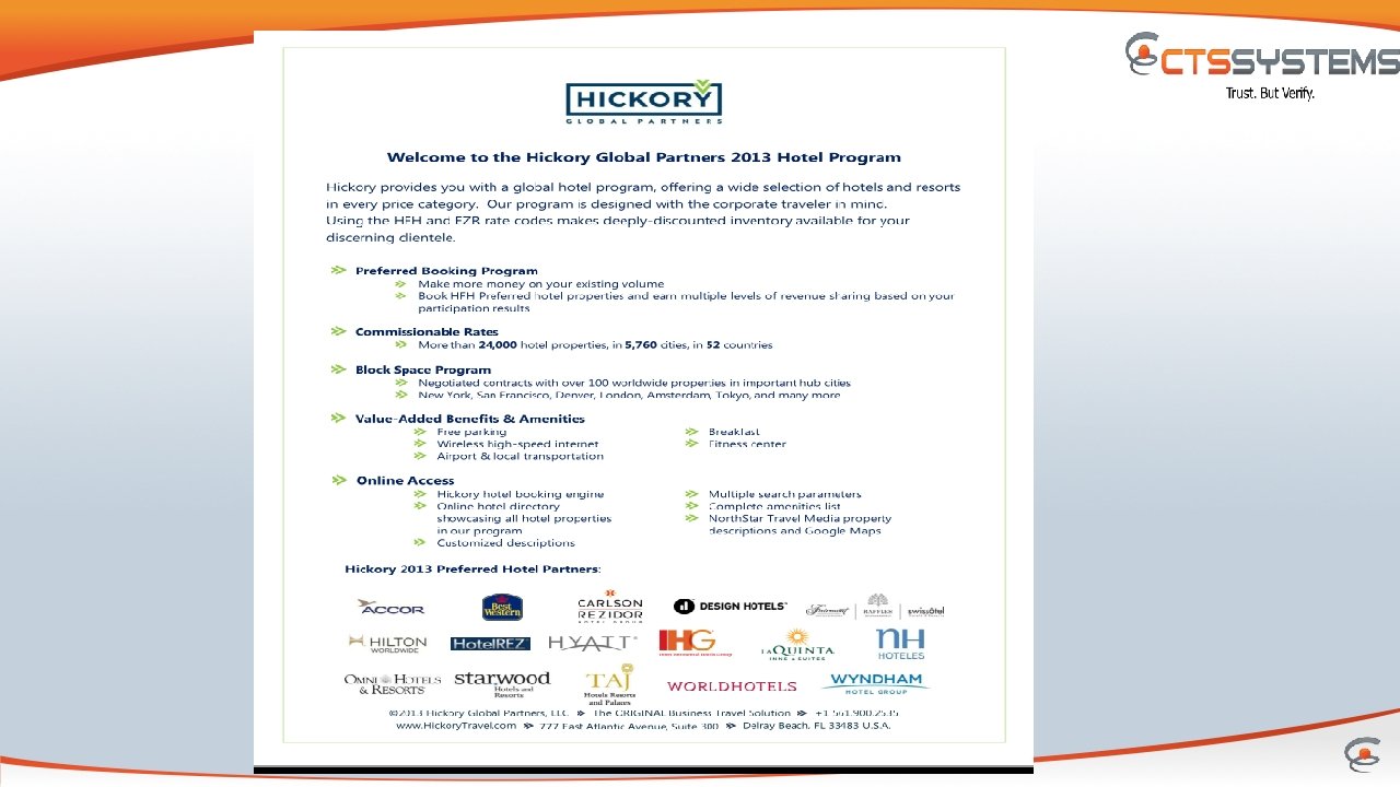 The CTS Difference v On-line Pay-Portal - designed to improve the efficiency & cost effectiveness of commission payments for hotels v Hotel normalization – removing the complexity from hotel bookings by developing a worldwide database of hotels that normalizes all hotel reservations into a standard name and proper chain code identification v DELL / TACS relationship – This allows us to search Property back office data before contacting the hotel to reduce cancelation and upgrade issues v Consulting - One on One consulting to ensure TMC gets the service they need v Calling Staff – we have a team that reaches out to the hotels to customize enquires and invoices and maintain a weekly contact at hotel level.