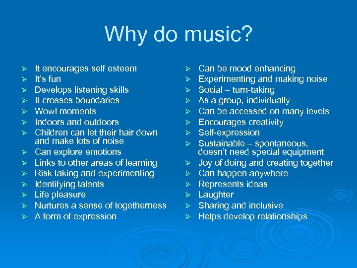 Why do music? Ø Ø Ø Ø It encourages self esteem It’s fun Develops listening skills It crosses boundaries Wow! moments Indoors and outdoors Children can let their hair down and make lots of noise Can explore emotions Links to other areas of learning Risk taking and experimenting Identifying talents Life pleasure Nurtures a sense of togetherness A form of expression Ø Ø Ø Ø Can be mood enhancing Experimenting and making noise Social – turn-taking As a group, individually – Can be accessed on many levels Encourages creativity Self-expression Sustainable – spontaneous, doesn’t need special equipment Joy of doing and creating together Can happen anywhere Represents ideas Laughter Sharing and inclusive Helps develop relationships