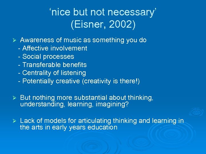‘nice but not necessary’ (Eisner, 2002) Ø Awareness of music as something you do - Affective involvement - Social processes - Transferable benefits - Centrality of listening - Potentially creative (creativity is there!) Ø But nothing more substantial about thinking, understanding, learning, imagining? Ø Lack of models for articulating thinking and learning in the arts in early years education
