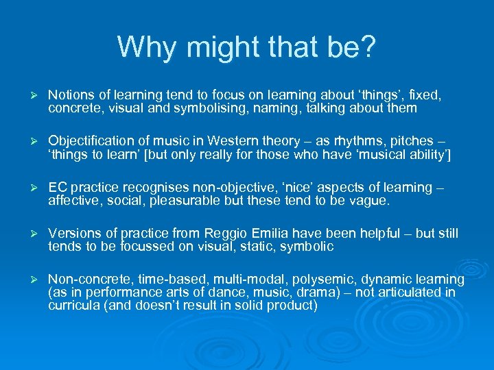 Why might that be? Ø Notions of learning tend to focus on learning about ‘things’, fixed, concrete, visual and symbolising, naming, talking about them Ø Objectification of music in Western theory – as rhythms, pitches – ‘things to learn’ [but only really for those who have ‘musical ability’] Ø EC practice recognises non-objective, ‘nice’ aspects of learning – affective, social, pleasurable but these tend to be vague. Ø Versions of practice from Reggio Emilia have been helpful – but still tends to be focussed on visual, static, symbolic Ø Non-concrete, time-based, multi-modal, polysemic, dynamic learning (as in performance arts of dance, music, drama) – not articulated in curricula (and doesn’t result in solid product)