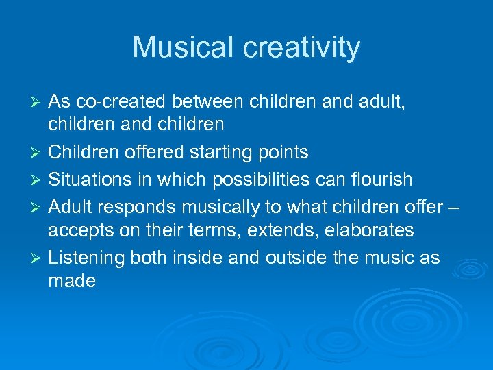 Musical creativity As co-created between children and adult, children and children Ø Children offered starting points Ø Situations in which possibilities can flourish Ø Adult responds musically to what children offer – accepts on their terms, extends, elaborates Ø Listening both inside and outside the music as made Ø