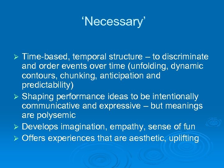 ‘Necessary’ Time-based, temporal structure – to discriminate and order events over time (unfolding, dynamic contours, chunking, anticipation and predictability) Ø Shaping performance ideas to be intentionally communicative and expressive – but meanings are polysemic Ø Develops imagination, empathy, sense of fun Ø Offers experiences that are aesthetic, uplifting Ø