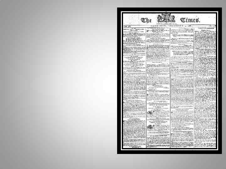 WHEN DID IT START • • The Times was founded by publisher John Walter on 1 January 1785 as The Daily Universal Register, with Walter in the role of editor. Walter had lost his job by the end of 1784 after the insurance company where he was working went bankrupt because of the complaints of a Jamaican hurricane. Being unemployed, Walter decided to set a new business up. It was in that time when Henry Johnson invented the logography, a new typography that was faster and more precise (three years later, it was proved that it was not as efficient as had been said). Walter bought the logography's patent and to use it, he decided to open a printing house, where he would daily produce an advertising sheet. The first publication of the newspaper The Daily Universal Register in Great Britain was 1 January 1785. Unhappy because people always omitted the word Universal, Ellias changed the title after 940 editions on 1 January 1788 to The Times. In 1803, Walter handed ownership and editorship to his son of the same name. Walter Sr had spent sixteen months in Newgate Prison for libel printed in The Times, but his pioneering efforts to obtain Continental news, especially from France, helped build the paper's reputation among policy makers and financiers. The Times used contributions from significant figures in the fields of politics, science, literature, and the arts to build its reputation. For much of its early life, the profits of The Times were very large and the competition minimal, so it could pay far better than its rivals for information or writers. Beginning in 1814, the paper was printed on the new steam-driven cylinder press developed by Friedrich Koenig. In 1815, The Times had a circulation of 5, 000. Thomas Barnes was appointed general editor in 1817. In the same year, the paper's printer James Lawson, died and passed the business onto his son John Joseph Lawson (1802– 1852). Under the editorship of Barnes and his successor in 1841, John Thadeus Delane, the influence of The Times rose to great heights, especially in politics and amongst the City of London. Peter Fraser and Edward Sterling were two noted journalists, and gained for The Times the pompous/satirical nickname 'The Thunderer' (from "We thundered out the other day an article on social and political reform. "). The increased circulation and influence of the paper was based in part to its early adoption of the steam-driven rotary printing press. Distribution via steam trains to rapidly growing concentrations of urban populations helped ensure the profitability of the paper and its growing influence. The Times was the first newspaper to send war correspondents to cover particular conflicts. W. H. Russell, the paper's correspondent with the army in the Crimean War, was immensely influential with his dispatches back to England. A wounded British officer reading The Times's report of the end of the Crimean War, in John Everett Millais' painting Peace Concluded. In other events of the nineteenth century, The Times opposed the repeal of the Corn Laws until the number of demonstrations convinced the editorial board otherwise, and only reluctantly supported aid to victims of the Irish Potato Famine. It enthusiastically supported the Great Reform Bill of 1832, which reduced corruption and increased the electorate from 400, 000 people to 800, 000 people (still a small minority of the population). During the American Civil War, The Times represented the view of the wealthy classes, favouring the secessionists, but it was not a supporter of slavery. The third John Walter, the founder's grandson, succeeded his father in 1847. The paper continued as more or less independent, but from the 1850 s The Times was beginning to suffer from the rise in competition from the penny press, notably The Daily Telegraph and The Morning Post. During the 19 th century, it was not infrequent for the Foreign Office to approach The Times and ask for continental intelligence, which was often superior to that conveyed by official sources