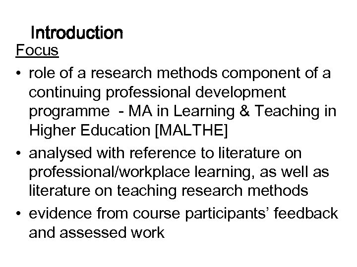 Introduction Focus • role of a research methods component of a continuing professional development programme - MA in Learning & Teaching in Higher Education [MALTHE] • analysed with reference to literature on professional/workplace learning, as well as literature on teaching research methods • evidence from course participants’ feedback and assessed work