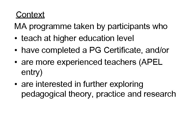 Context MA programme taken by participants who • teach at higher education level • have completed a PG Certificate, and/or • are more experienced teachers (APEL entry) • are interested in further exploring pedagogical theory, practice and research