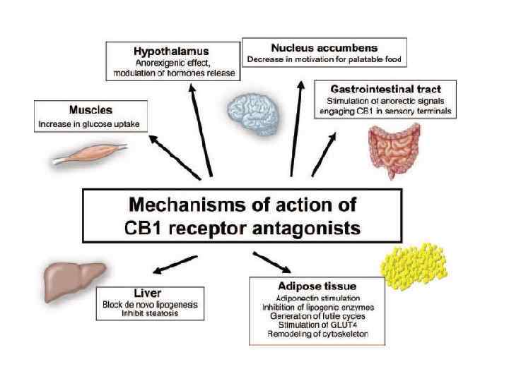 Римонабант Discovery of the cannabinoid receptors has led to the development of rimonabant, a cannabinoid-1 (CB 1) antagonist. Selective blockade of this receptor has been shown to lead to decreased appetite and food intake in animal models. Clinical studies have shown that rimonabant 20 mg once daily produces significant decreases in weight and waist circumference in obese human subjects and improves the lipid profile and glucose control. American Journal of Health-System Pharmacy, 2007, Vol. 64, Issue 5, 481 -489
