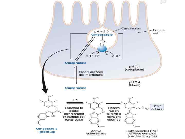 Механизм действия ингибиторов протонного насоса 1. Всасывание в тонком кишечнике, попадание в кровь 2. Прохождение в незаряженном виде через мембраны париетальной клетки в секреторные канальцы 3. Протонирование и концентрирование в канальцах 4. Внутримолекулярная перестройка (образование циклического сульфенамида) 5. Образование ковалентной S-S-cвязи с SH-группой Н, К-насоса + 1 кровь + + + 5 + 2 париетальная клетка 3, 4 + Н+ + канальцы S S +