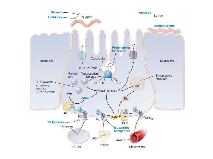Атропин Пирензепин n. vagus G М 3 + Гаст-+ рин М 2 D - М 1 М 3 + HCl Сомат Гист Н 2 оастатин мин Энтерохромаффино. Париетальная подобная клетка