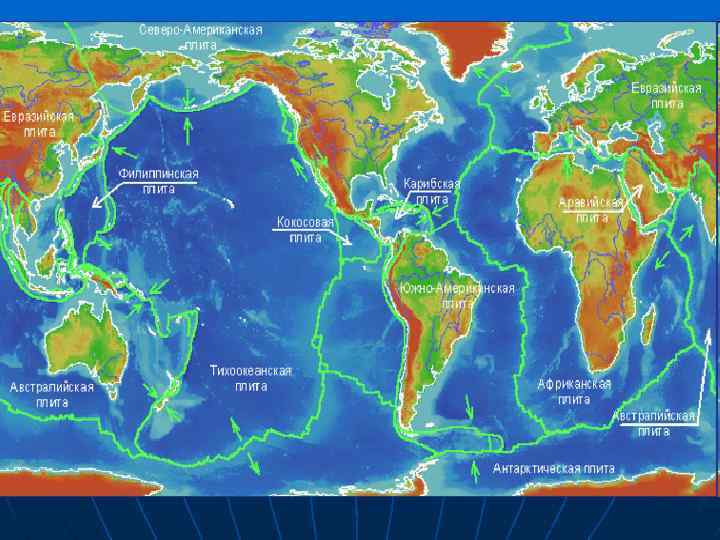 Главные сейсмические пояса Земли 1. Тихоокеанский – узкой полосой обрамляет Тихий океан и связан с системой глубокофокусных желобов. Предельно высокая сейсмичность в этой области вызвана подвигом холодной океанической литосферы под материки, окружающие океан и окраинные моря. 2. Евроазиатский – протягивается с северо-запада на юго-восток и совпадает со складчатыми сооружениями альпийского возраста. К нему примыкает также ряд сейсмоактивных областей новейшей тектонической активизации. Землетрясения в этом поясе происходят в результате давления Евроазиатской плиты с одной стороны и Индийской, Аравийской и Африканской плит – с другой. 3. Срединно-океанических хребтов и континентальных рифтовых зон – характеризуется сейсмичностью, связанной с раздвижением литосферы.