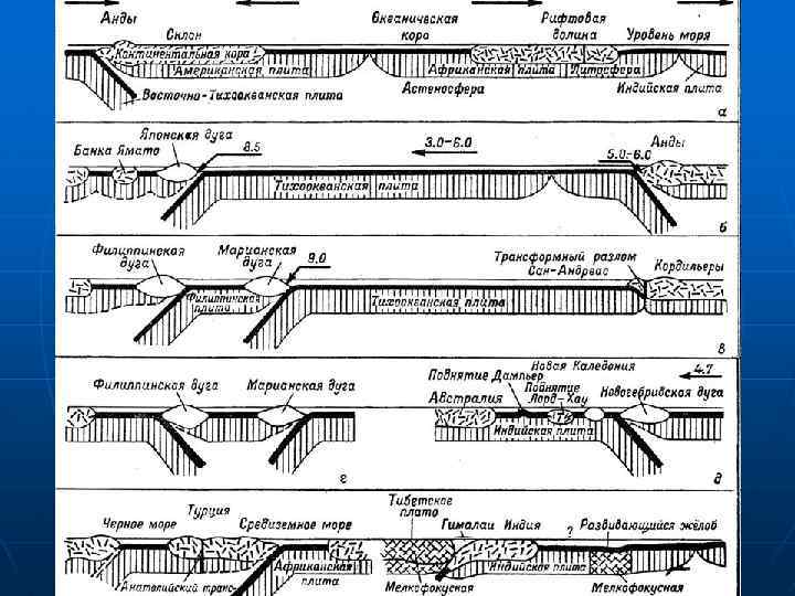 Существует 3 рода взаимных перемещений тектонических плит и соответственно границ между ними: - ДИВЕРГЕНТНЫЕ границы, вдоль которых происходит раздвижение плит (спрединг). На дивергентных границах, вдоль спрединга, происходит непрерывное рождение новой океанской коры. Поэтому эти границы называют еще КОНСТРУКТИВНЫМИ (за счет океанской коры наращивается континентальная кора); - КОНВЕРГЕНТНЫЕ границы, на которых идет сближение плит, обычно выражающее подвигом океанской плиты под континентальную или под другую океанскую плиту (процесс субдукции). Столкновение двух континентальных плит, тоже обычно с некоторым подвигом одной под другую, называют коллизией; - ТРАНСФОРМНЫЕ границы, вдоль которых происходит горизонтальное скольжение одной плиты относительно другой по плоскости трансформного разлома. Все границы плит на поверхности Земли сочленяются друг с другом. Особый интерес представляют тройные сочленения, где сходятся 3 такие границы, причем они могут быть разного рода – оси спрединга, оси глубоководных желобов, зоны субдукции, трансформные разломы.
