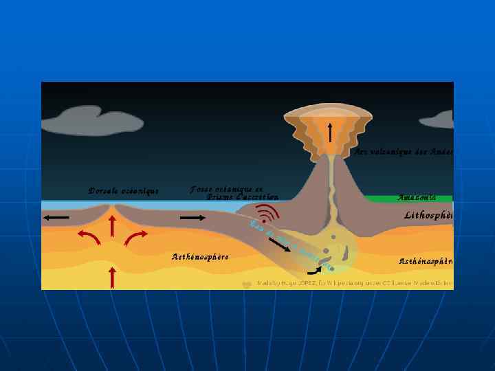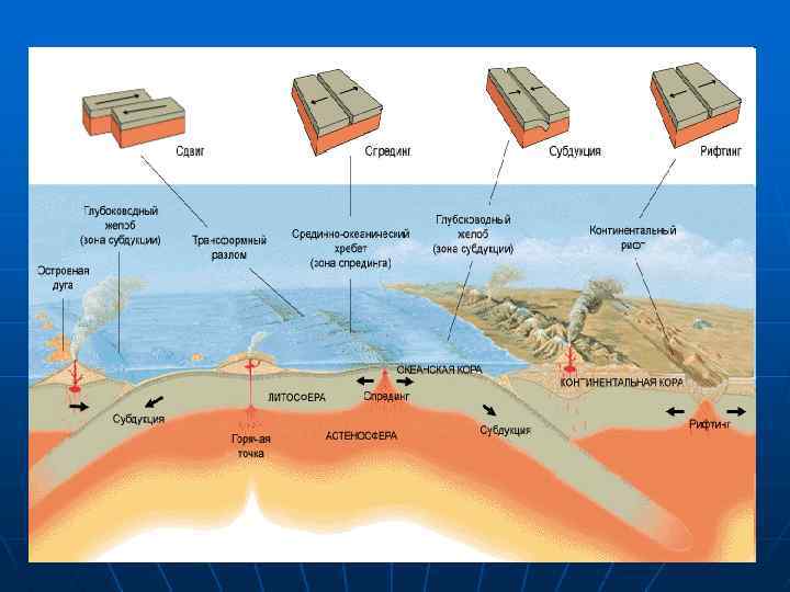 n n Площадь поглощаемой в зонах субдукции океанской коры равна площади коры, нарождающейся в зоне спрединга. Субдукция компенсирует спрединг, поэтому общая площадь Земли, ее объем и радиус могут оставаться неизменными, хотя в принципе возможен учет некоторых его изменений, предполагаемых гипотезами контрактации, пульсации и расширения Земли. Волочение литосферных плит астеносферным течением вследствие вязкого сцепления между литосферой и астеносферой не считается единственной и даже главной движущей плиты силой, поскольку вязкости литосферы и астеносферы существенно различаются. Большая роль отводится двум другим силам – отталкиванию литосферных плит от осей срединных хребтов под влиянием гравитации вследствие их значительного превышения над абиссальными равнинами, а также затягиванию в зоны субдукции вследствие того, что зрелая океанская литосфера тяжелее астеносферы, в которую она погружается