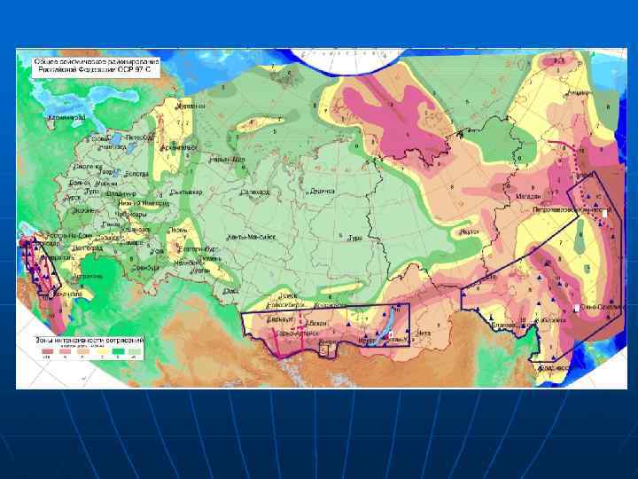 ПРОБЛЕМА ПРОГНОЗА ЗЕМЛЕТРЯСЕНИЙ n n При сейсмическом районировании указывается только максимально возможная магнитуда землетрясения (на заданной территории) для расчета специальных сейсмических конструкций, возведение которых регламентируется строительными нормами и правилами. Результаты долгосрочного прогноза землетрясений также учитываются при планировании капитального строительства. Они позволяют подойти к оценке сейсмического риска территории с учетом уязвимости застройки и населения.