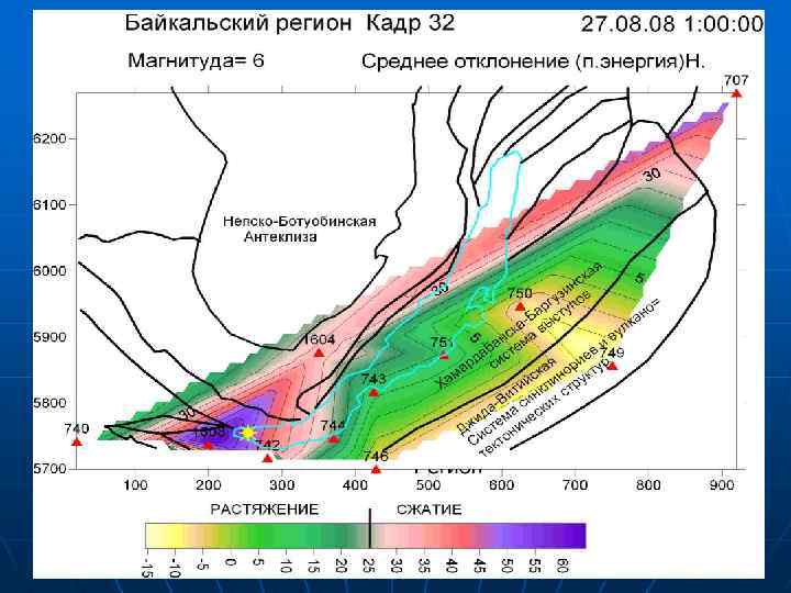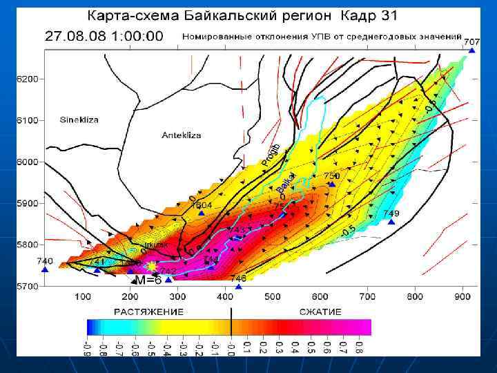 Гидрогеодеформационная модель Байкальского региона Практически на всей территории региона возможны землетрясения силой 8 -10 баллов. n В особом ряду стоят три района Байкальского рифта, где по долгосрочному прогнозу возможны землетрясения в 10 -11 баллов. Это Тункинская система впадин, район дельты р. Селенги и Баргузинская межгорная впадина. За последние 150 лет в пределах Байкальского рифта произошло до 15 землетрясений силой 9 -10 баллов. n Гидрогеодеформационная модель Байкальского региона с рифтовым типом геодинамического режима в последние 4 года n определялась частыми и очень резкими изменениями структурного плана ГГД-поля, на фоне которых происходили землетрясения, в основном, с магнитудами не выше 4 -5. Существующая геодинамическая обстановка характеризовалась активной динамикой структурных перестроений ГГД-поля и относительно невысокой сейсмичностью. Можно ожидать, что при изменении существующей динамики структурных перестроений ГГД-поля - в условиях формирования устойчивых, длительно сохраняющихся его структур напряжения растяжения, сейсмические процессы в Байкальском регионе с рифтовым типом геодинамического режима приведут к проявлению сильных землетрясений с магнитудой 7 и выше.