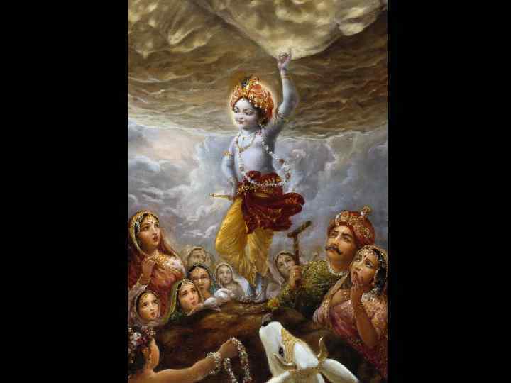 TEXT 3 (consonants dh, r) dhare dharädhara-dharaà dhärädhara-dhur-ärudhi dhéra-dhér ärarädhädhi-rodhaà rädhä dhuraàdharam dhare—at the hill; dharä-dhara—of the hill (the earth is called dharä because it supports all the living entities, and hills and mountains are called dharä-dharas because they support (dhara) the earth (dharä)); dharam—the holder; dhärä-dhara—of the clouds (clouds are called dhärä-dharas because they bear (dhara) a shower (dhärä)); dhur—the burden; ärudhi—blocking; dhéra—steady; dhéù—mind; ärarädha— worshiped; ädhi—distress; rodham—removing; rädhä—Rädhä; dhuraàdharam—the Supreme Lord. Beneath Govardhana hill, which was blocking the forceful attack of the devastating clouds, steady-minded Rädhä worshiped the Supreme Lord, who held up the hill and removed the anguish of His devotees.