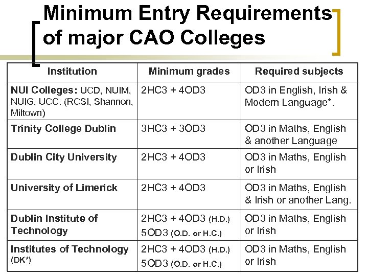 Minimum Entry Requirements of major CAO Colleges Institution Minimum grades NUI Colleges: UCD, NUIM, 2 HC 3 + 4 OD 3 NUIG, UCC. (RCSI, Shannon, Miltown) Required subjects OD 3 in English, Irish & Modern Language*. Trinity College Dublin 3 HC 3 + 3 OD 3 in Maths, English & another Language Dublin City University 2 HC 3 + 4 OD 3 in Maths, English or Irish University of Limerick 2 HC 3 + 4 OD 3 in Maths, English & Irish or another Lang. Dublin Institute of Technology 2 HC 3 + 4 OD 3 (H. D. ) 5 OD 3 (O. D. or H. C. ) OD 3 in Maths, English or Irish Institutes of Technology 2 HC 3 + 4 OD 3 (H. D. ) 5 OD 3 (O. D. or H. C. ) OD 3 in Maths, English or Irish (DK*)