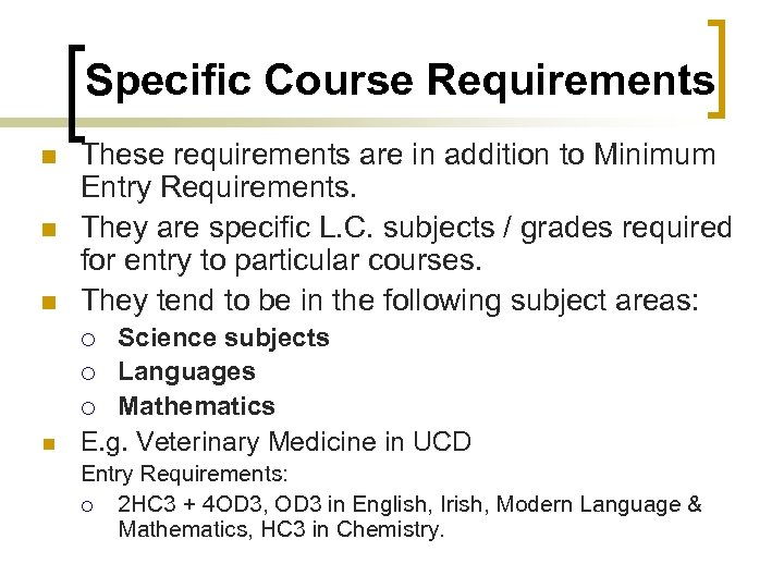 Specific Course Requirements n These requirements are in addition to Minimum Entry Requirements. They are specific L. C. subjects / grades required for entry to particular courses. They tend to be in the following subject areas: n Science subjects ¡ Languages ¡ Mathematics E. g. Veterinary Medicine in UCD n n ¡ Entry Requirements: ¡ 2 HC 3 + 4 OD 3, OD 3 in English, Irish, Modern Language & Mathematics, HC 3 in Chemistry.